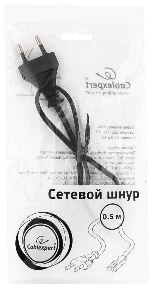 Купить Cablexpert шнур сетевой для магнитофона 0.5м, CEE 7/16 - C7, 2-pin, 2х0,5, черн., пакет (арт. 710811)