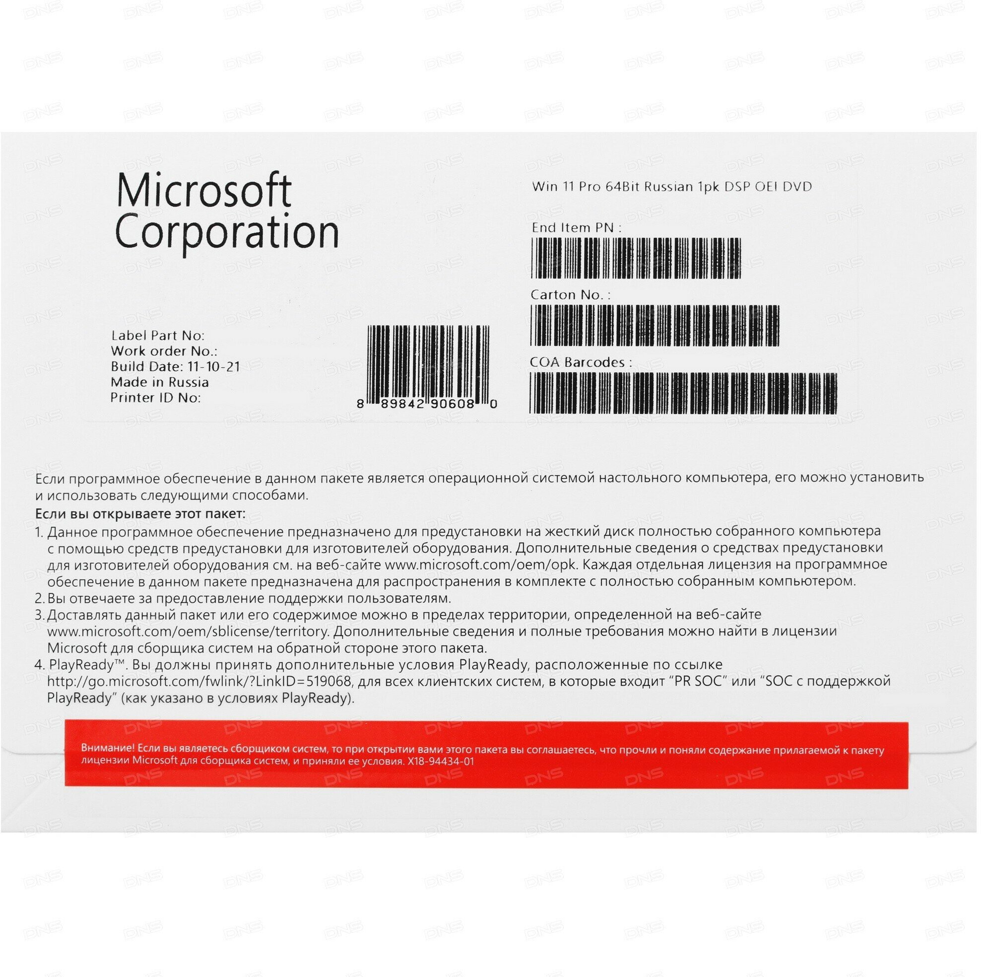 Операционная система Microsoft Windows 11 Pro 64-bit Russian (fqc-10547) 1pk DSP OEI DVD .