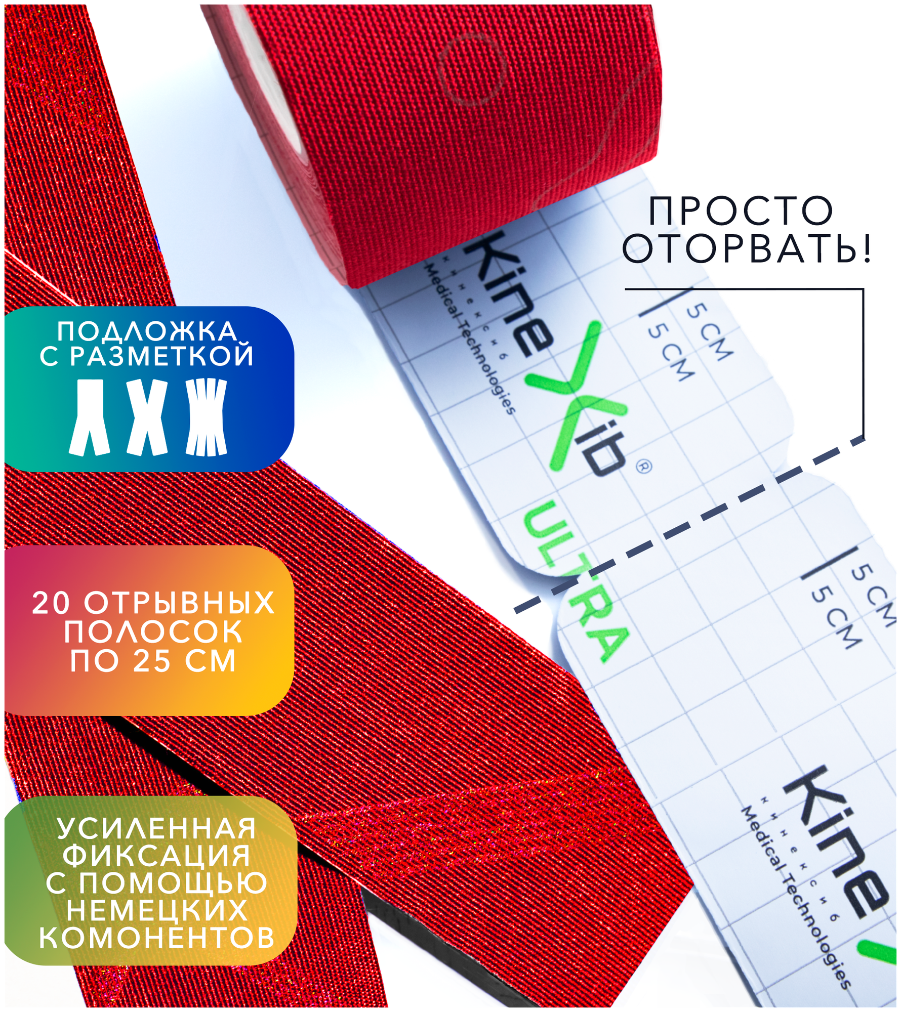 Кинезио тейп KineXib ULTRA, тейпы для тела, тейп спортивный шелковый (5м*5см), красный