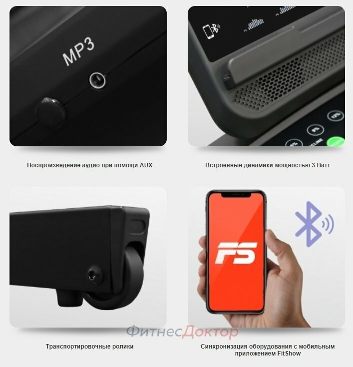 | Особенности | язык интерфейса: английский, показания консоли скорость, время, шагометр, дистанция, калории, пульс, жироанализатор Body Fat; спецификация программ: ручной режим, 9 встроенных программ (легкий бег, аэробный бег, интервальная тренировка, сжигание жира, пересеченная местность, выносливость, темповая тренировка, снижение веса), 3 целевых (дистанция, калории, время), 3 пользовательских и 3 пульсозависимых режима; мобильное приложение FitShow; воспроизведение аудио файлов, встроенные динамики (3 Ватт), разъем AUX; измерение пульса, нагрудный кардиодатчик есть (поставляется отдельно); воспроизведение аудио файлов, встроенные динамики (3 Ватт) Разъемы AUX; измерение пульса, нагрудный кардиодатчик есть (поставляется отдельно), подставка под планшет/смартфон, питание от сети 220 В, Диапазон угла наклона 0 - 4 %, шаг регулировки угла наклона: 1 градус; беговое полотно 1.6 мм. двухслойное Habasit NVT-256, парафинированная дека, отсеки для аксессуаров, размер в сложенном виде (Д*Ш*В): 103 х 71 х 131 см |