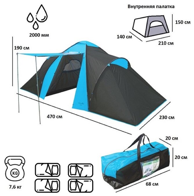 | Особенности | внутренние карманы / проклеенные швы / вентиляционные отверстия / окна / навес / внутренняя палатка |
