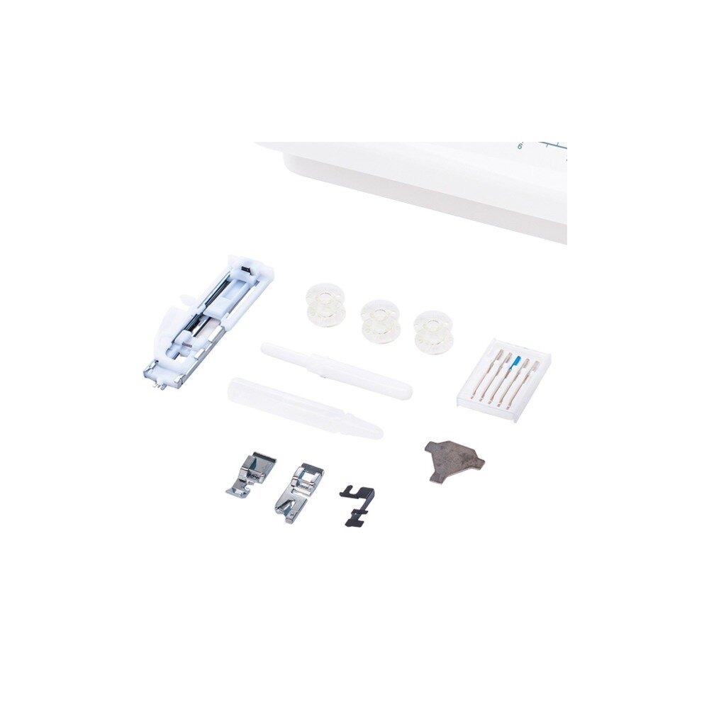 В комплектации вспарыватель, 4 шпульки, 3 иглы универсальных, ножная педаль. Строчки ровные Хорошая фирма, следственно качествество механизма. Небольшая стоимость |