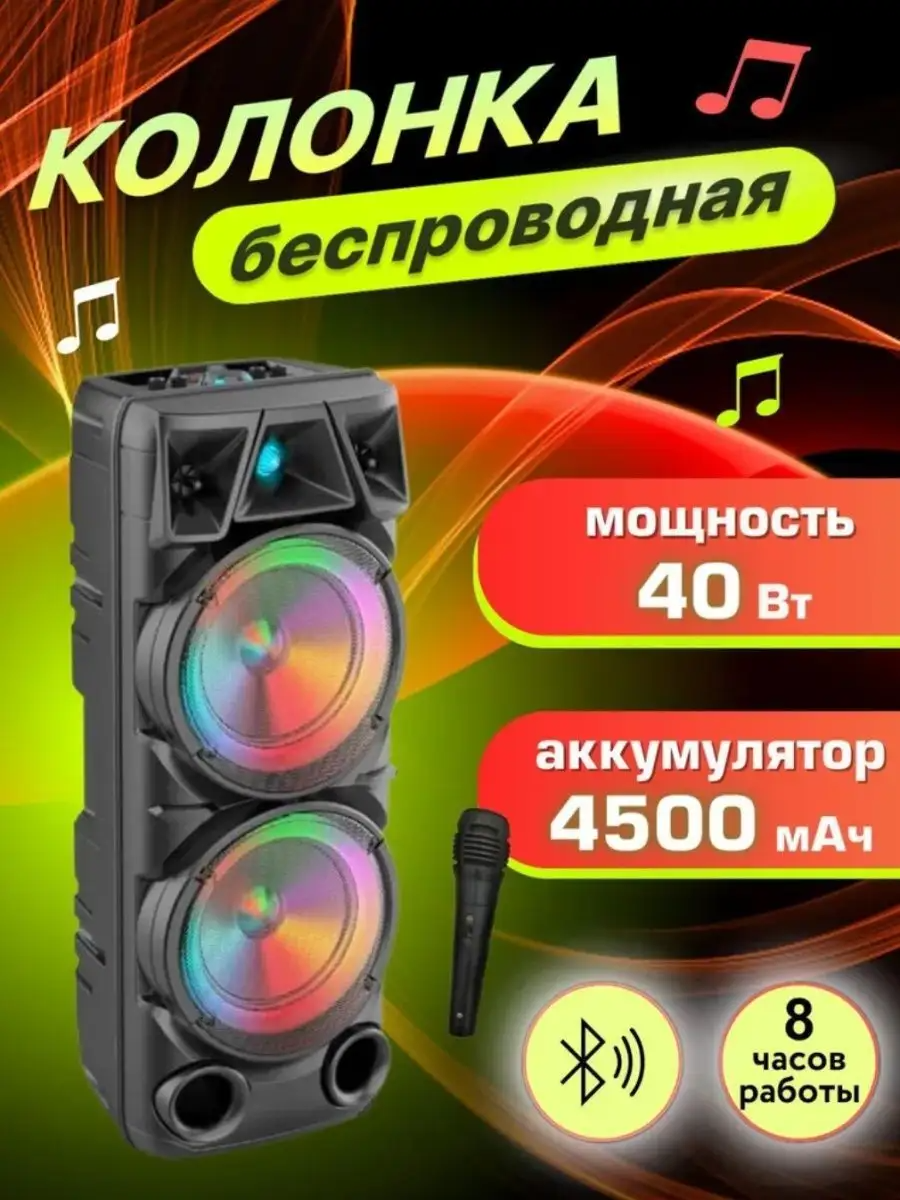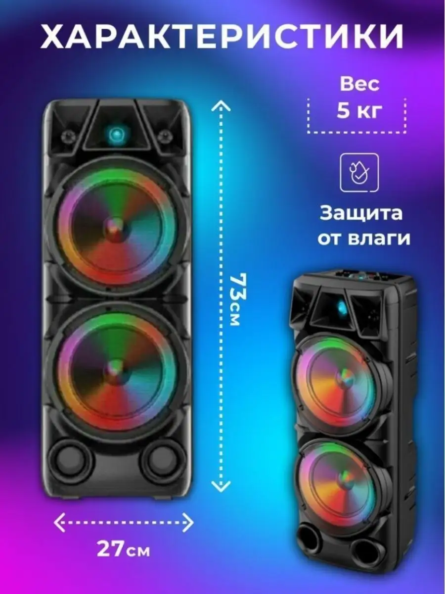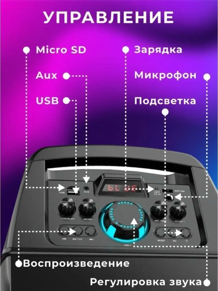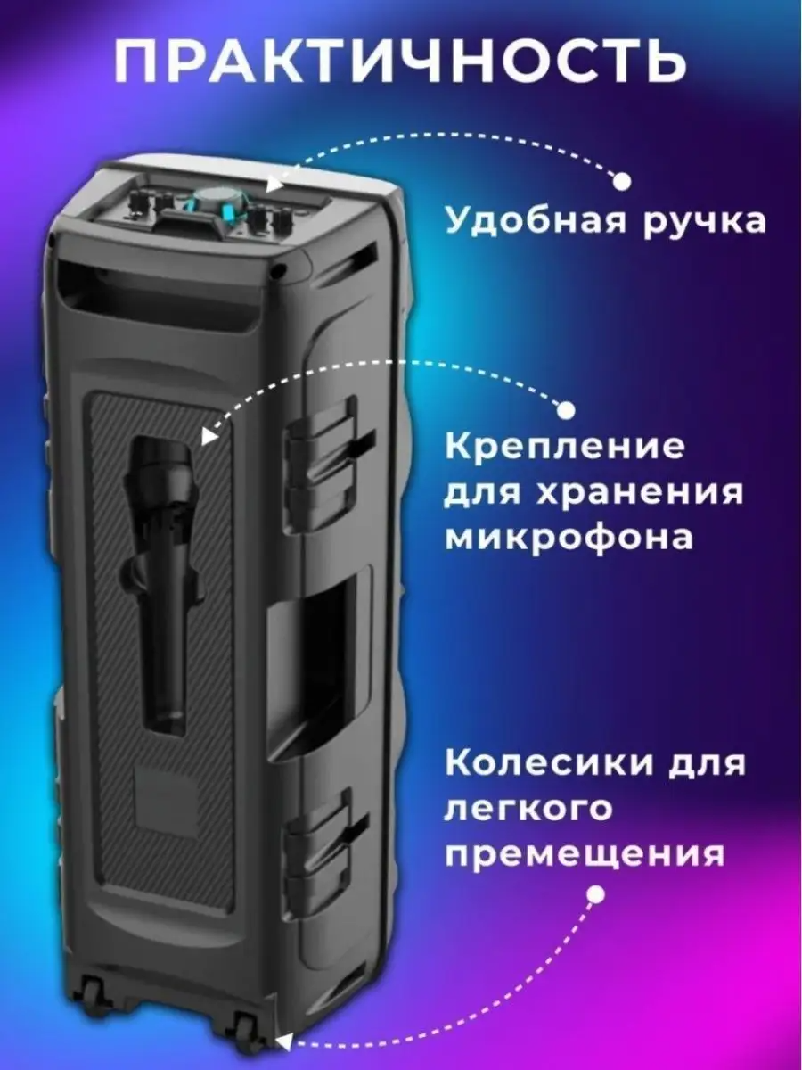 | Особенности | FM-радио / встроенный микрофон (функция HandsFree) / дисплей / караоке / поддержка microSD / режим Power Bank / ручка / световые эффекты |