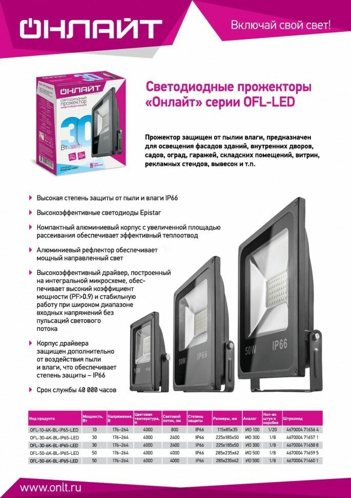СохранитьCветодиодный LED прожектор Онлайт 30W (Вт) 6000K 2400lm IP66 225x185x50 176-264 OFL-30-6K-BL-IP65-LED 71658 интересное: