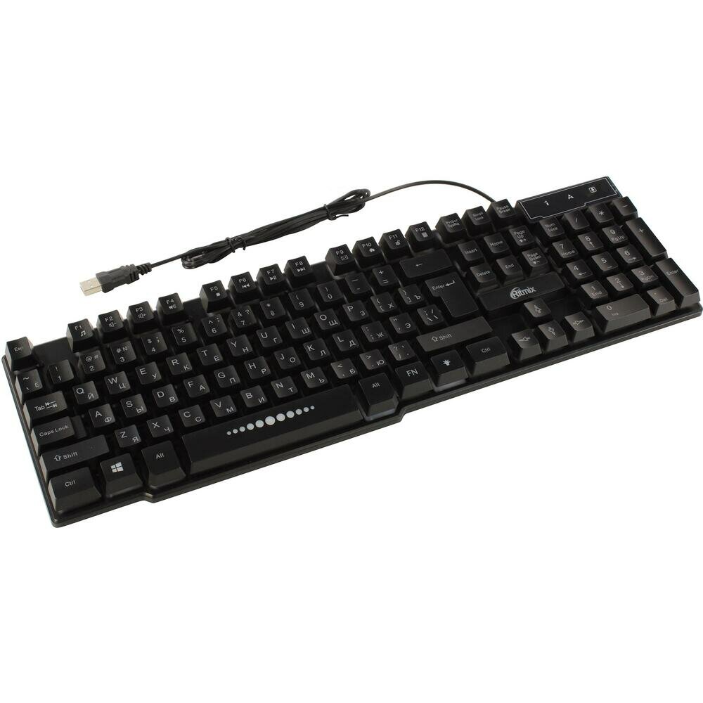 Клавиатура RITMIX RKB-200, черная, USB. Интерфейс: USB. Количество клавиш: 104+12. Длина кабеля: 150 см. Многоцветная подсветка кнопок и символов. (1/20)