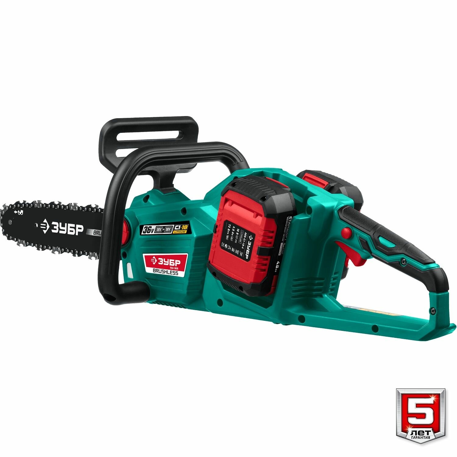 ЗУБР 36В бесщеточная пила цепная, 2х18В АКБ (4Ач). ПЦЛ-3635-42