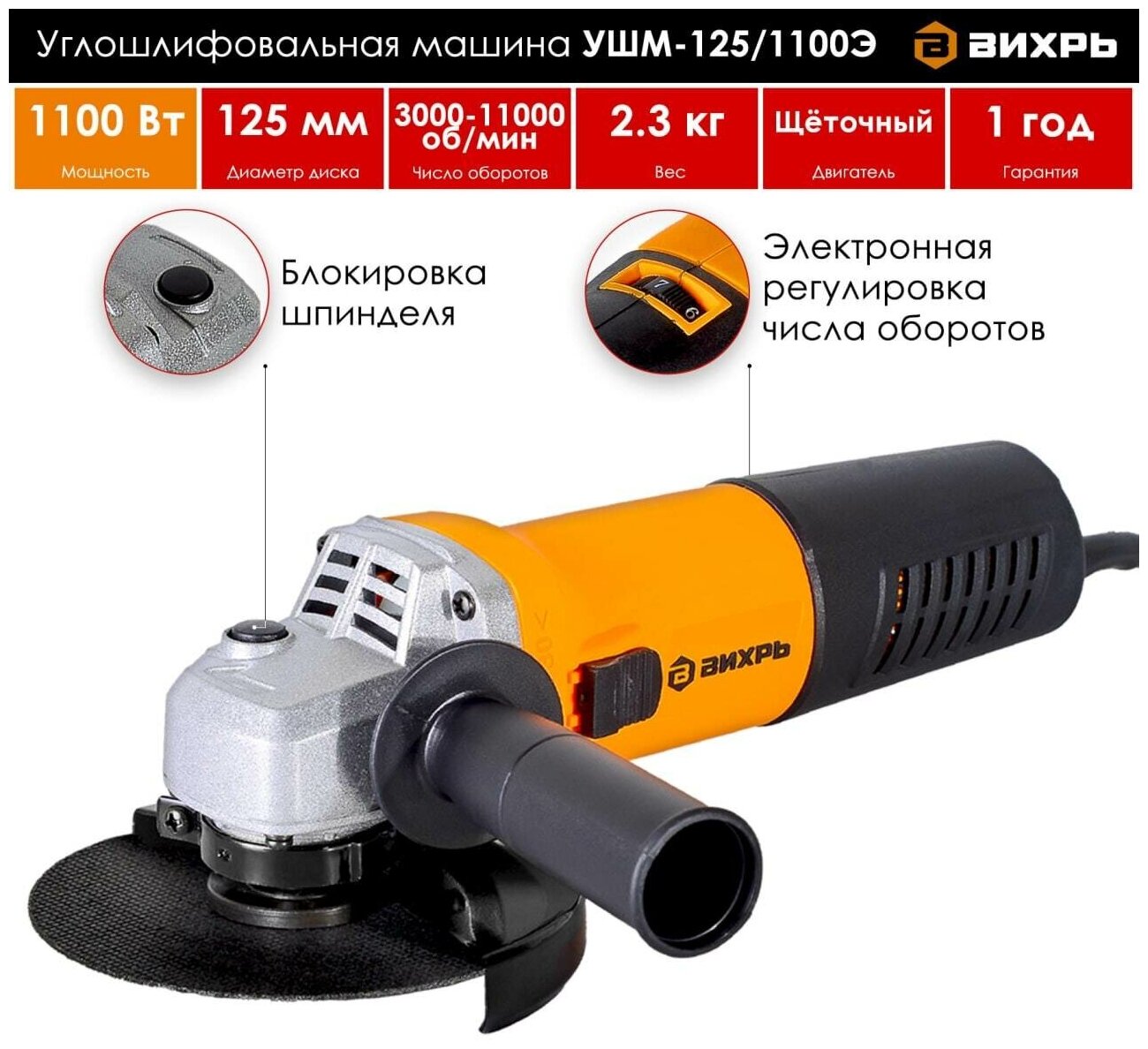 УШМ вихрь УШМ-125/1100Э, 1100 Вт, 125 мм оранжевый