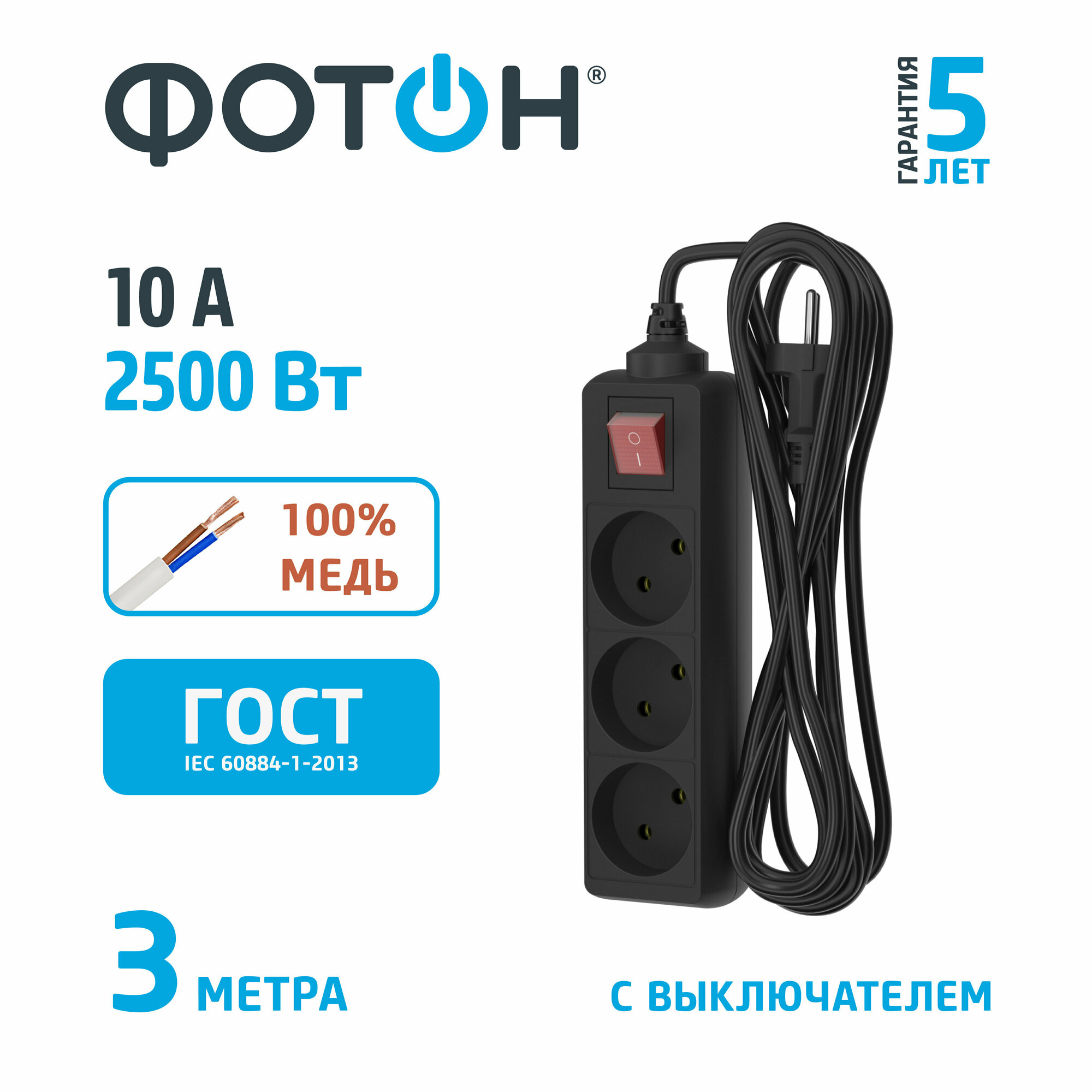 Удлинитель сетевой для розетки фотон 10А 3 метра 3 розетки с выключателем черный, ГОСТ