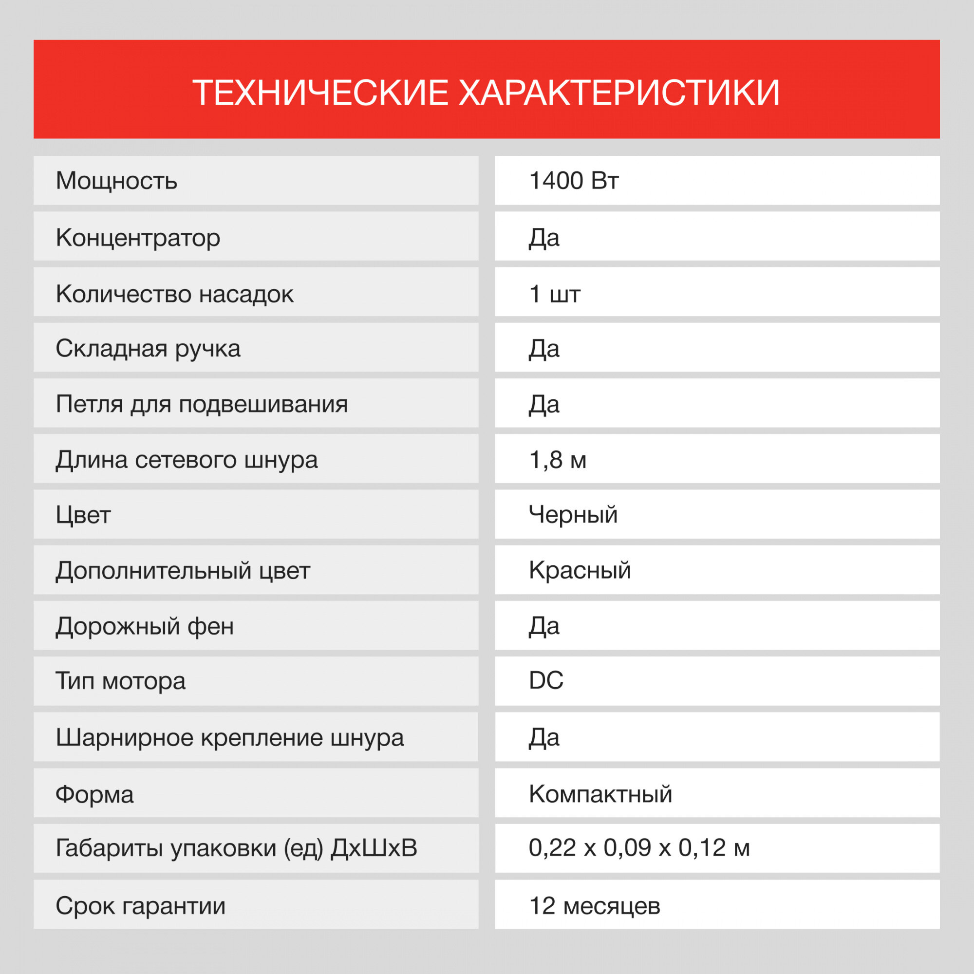 | Мощность фена | 1400 Вт |