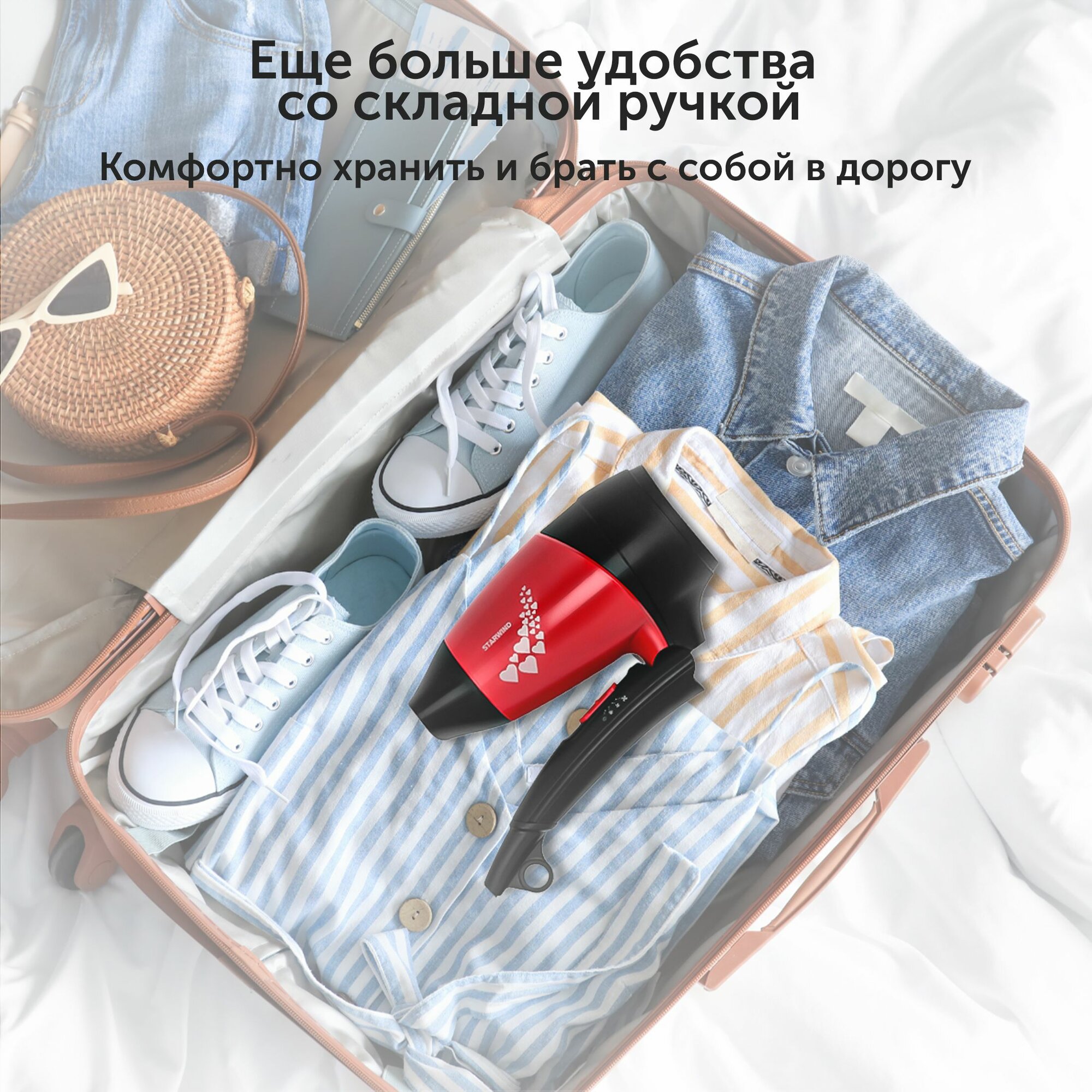 Складная ручка, компактно ложится в чемодан. Хорошая мощность 1400 Вт. |