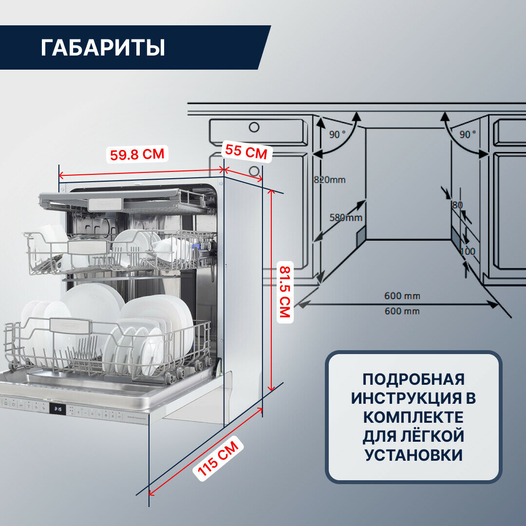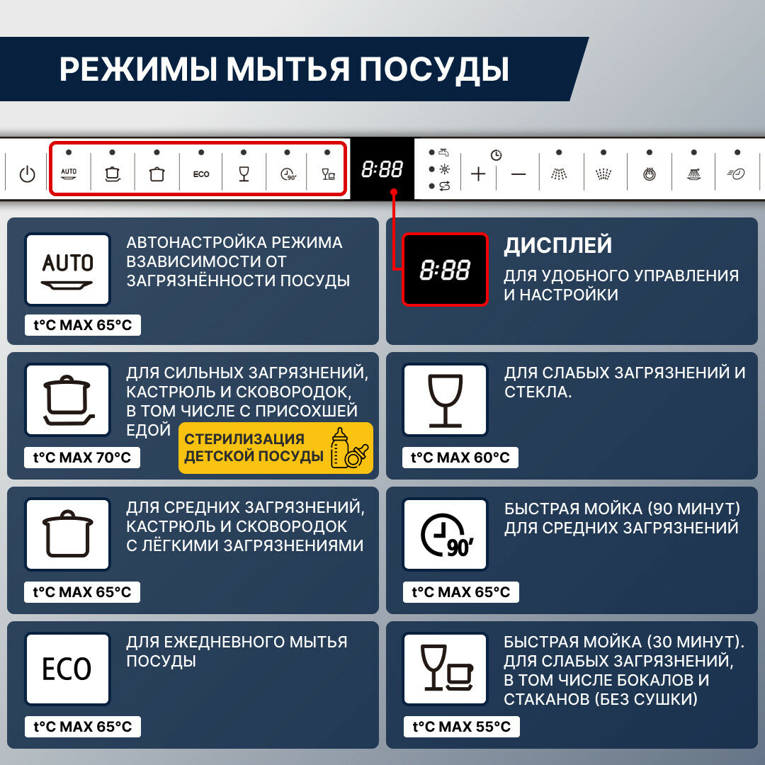 Луч на полу Индикаторы соли и ополаскивателя Достаточно программ на разную длительность Подсветка внутри |
