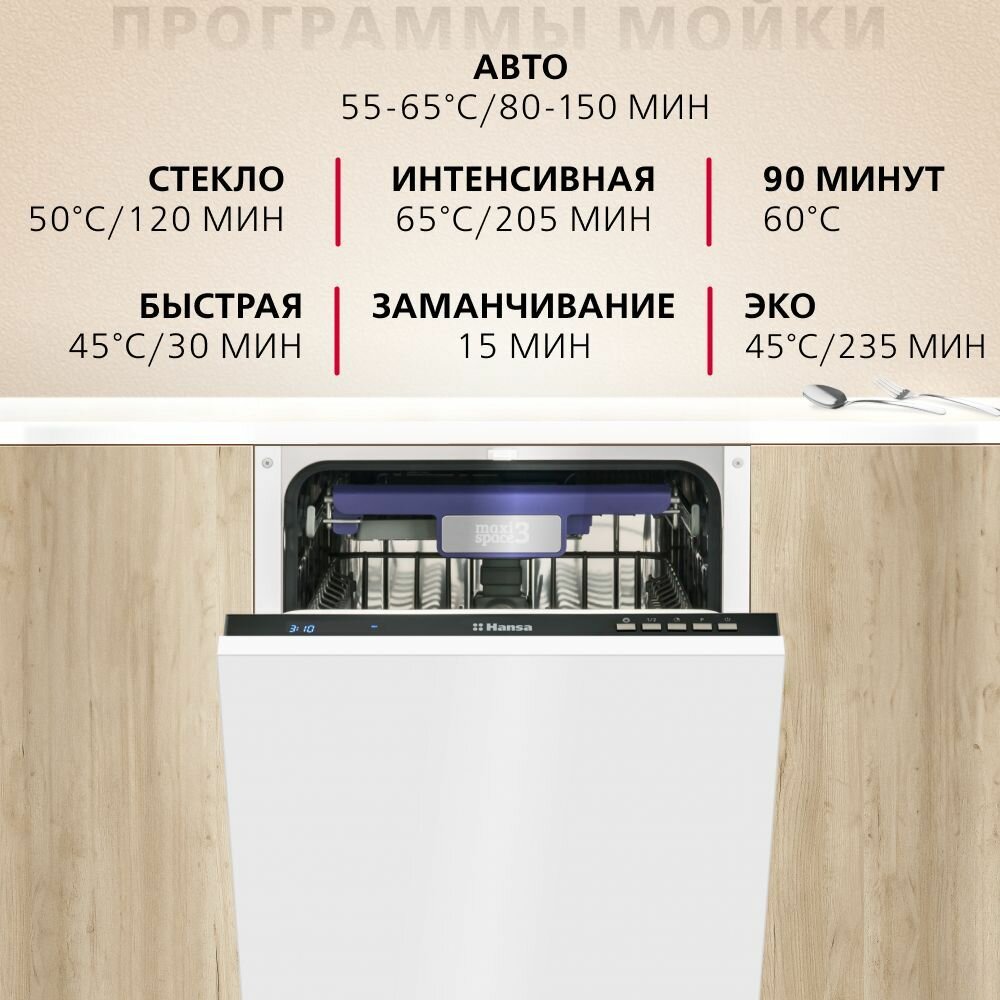 Встраиваемая посудомоечная машина Hansa ZIM408EH, 45 см, компактная, с защитой от протечек, 8 программ, 3 корзины, режим быстрой мойки и половинной загрузки, отсрочка старта интересное: