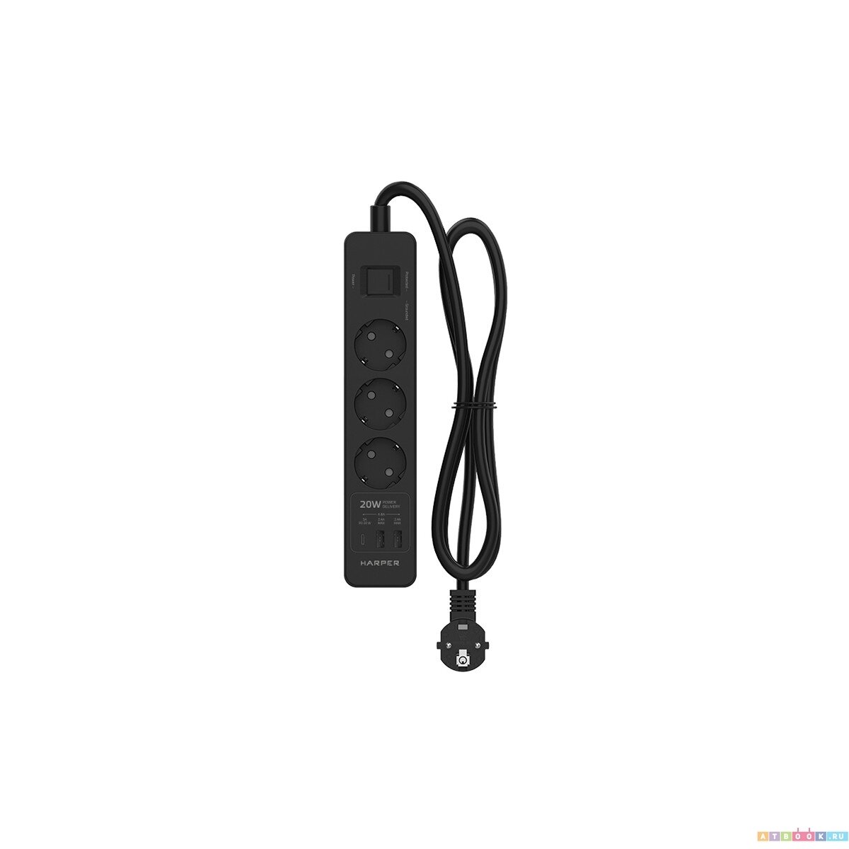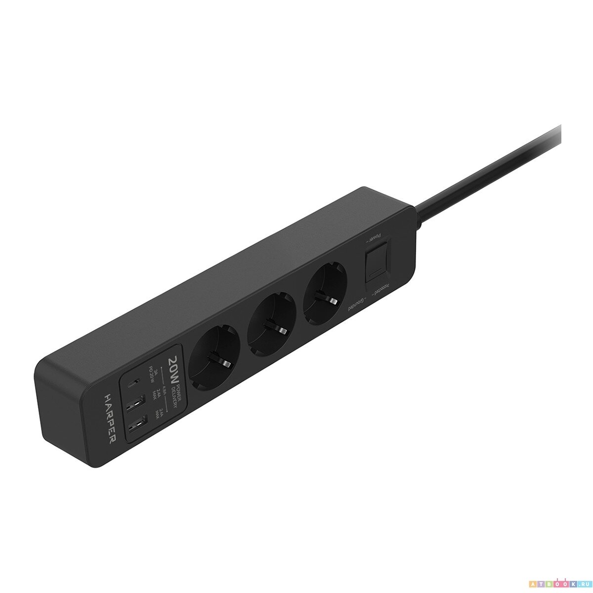 Сетевой фильтр Harper UCH-350 black PD3.0 (3 розетки, 2 USB-порта, 1 порт Type-C, 1,5 метра, шторки, встроенная защита от скачков напряжения и тока)