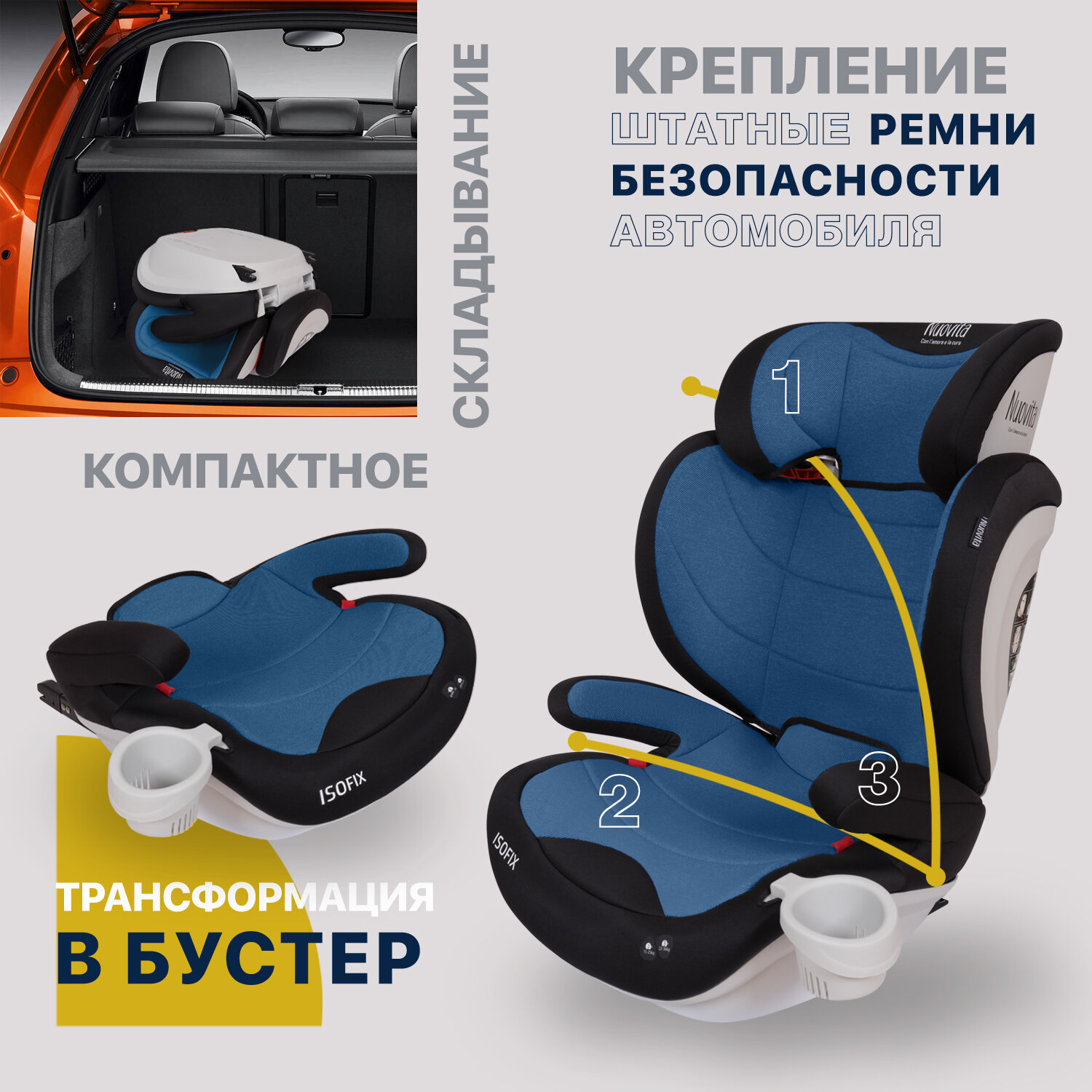 Автокресло детское с креплением Isofix Nuovita Maczione N23i-1, группа 2/3 от 3,5 до12 лет, весом от 15 до 36 кг/ трансформируется в бустер (Blu/Голубой)