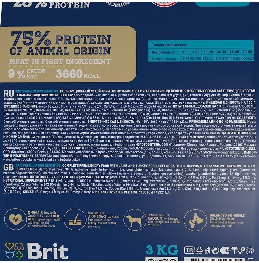 BRIT PREMIUM Сухой корм с ягнёнком и индейкой для собак всех пород "Dog Sensitive", 3 кг