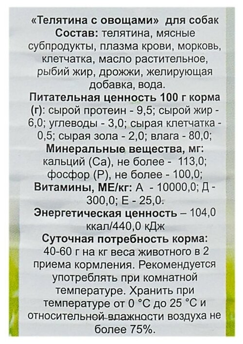 | Состав | Телятина, овощи, витаминно-минеральный комплекс, растительное масло. |