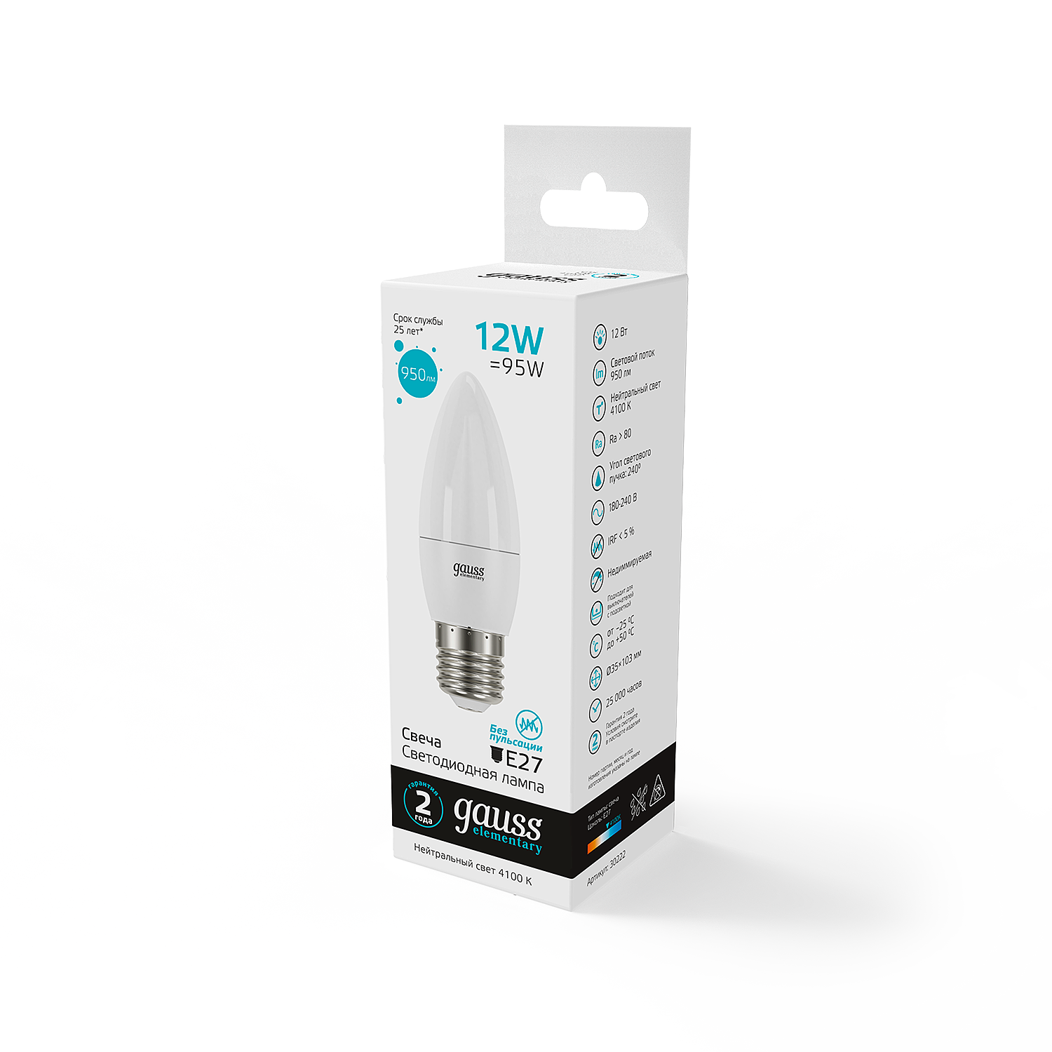 Gauss Elementary Свеча E27 12W(950lm) 4100K 4K матов., пластик 30222 (арт. 795514)
