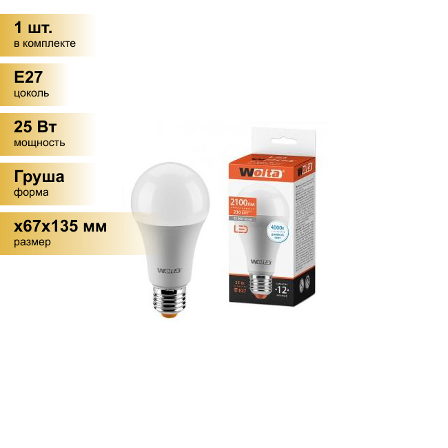 (12 шт.) Светодиодная лампочка Wolta лампа св/д ЛОН A67 E27 25W(2100Lm) 4000K 4K 138x67x67 матовая 25S67BL25E27 Нейтральный белый. Цоколь E27