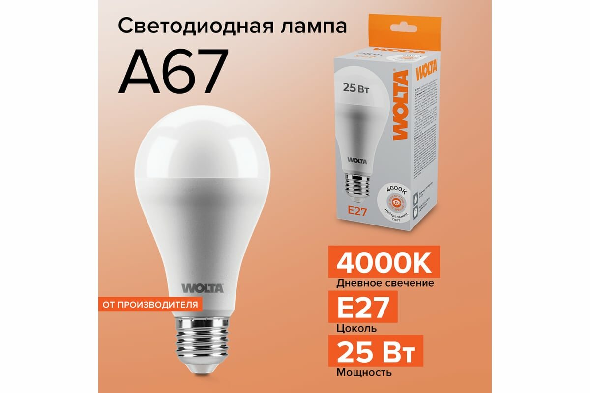(2 шт.) Светодиодная лампочка Wolta лампа св/д ЛОН A67 E27 25W(2100Lm) 4000K 4K 138x67x67 матовая 25S67BL25E27 . Цоколь E27