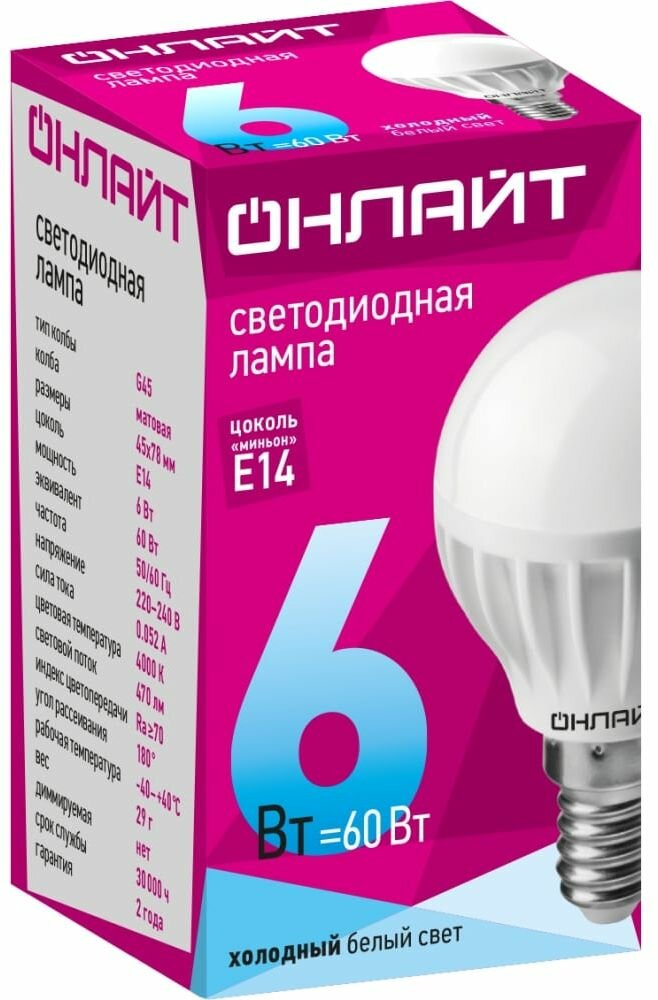 Лампа светодиодная LED матовая Онлайт, E14, G45, 6 Вт, 4000 K, холодный свет