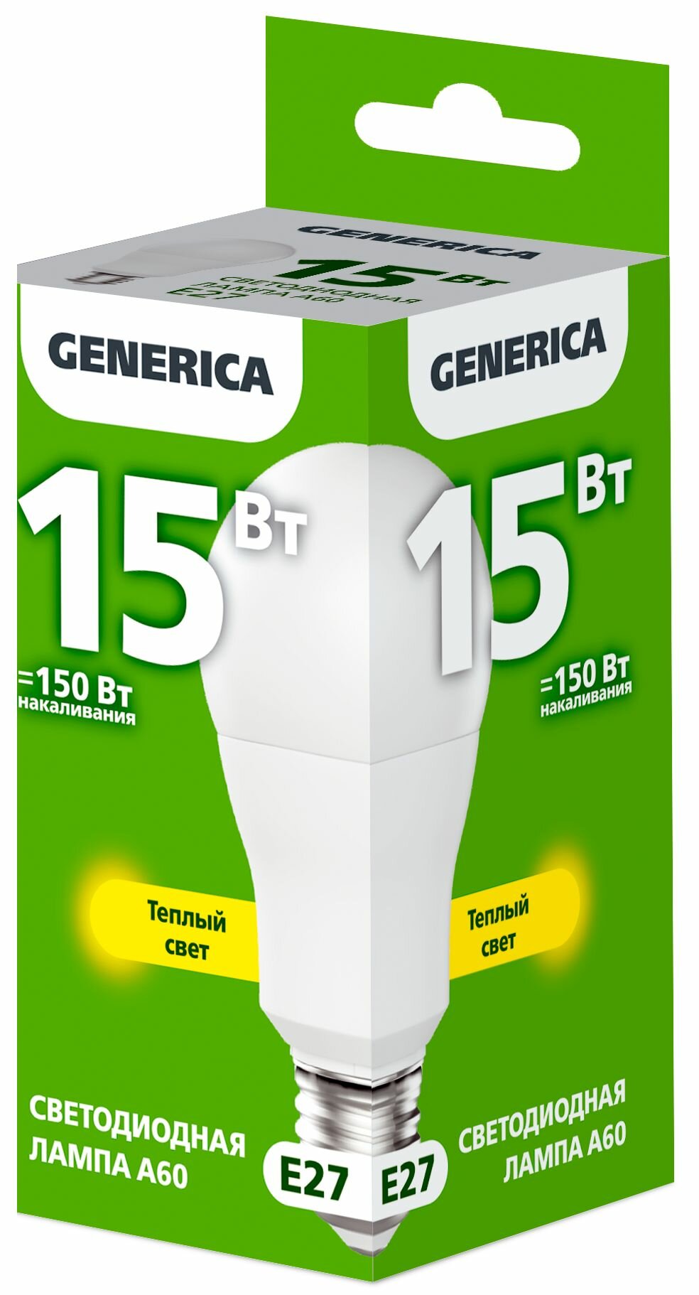 Лампа светодиодная GENERICA A60, 15 Вт, груша, 3000 К, E27, 230 В, LL-A60-15-230-30-E27-G