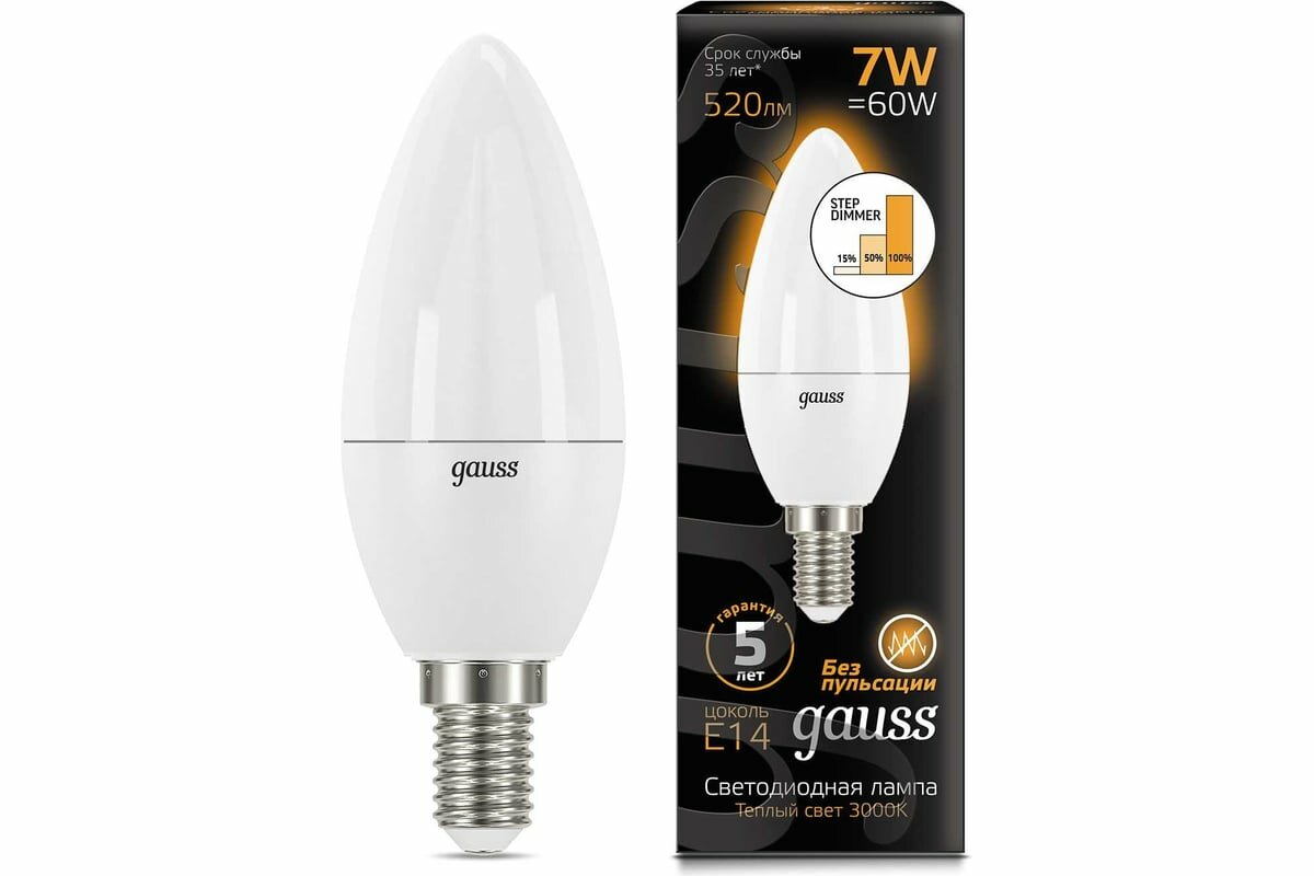 Купить Лампа Gauss LED Свеча E14 7W 520lm 3000К step dimmable 103101107-S