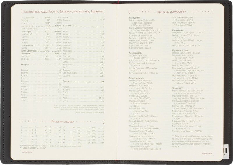 | Особенности | карман для визиток / ляссе / поля / прошивка по периметру обложки / справочная информация / цветной обрез |