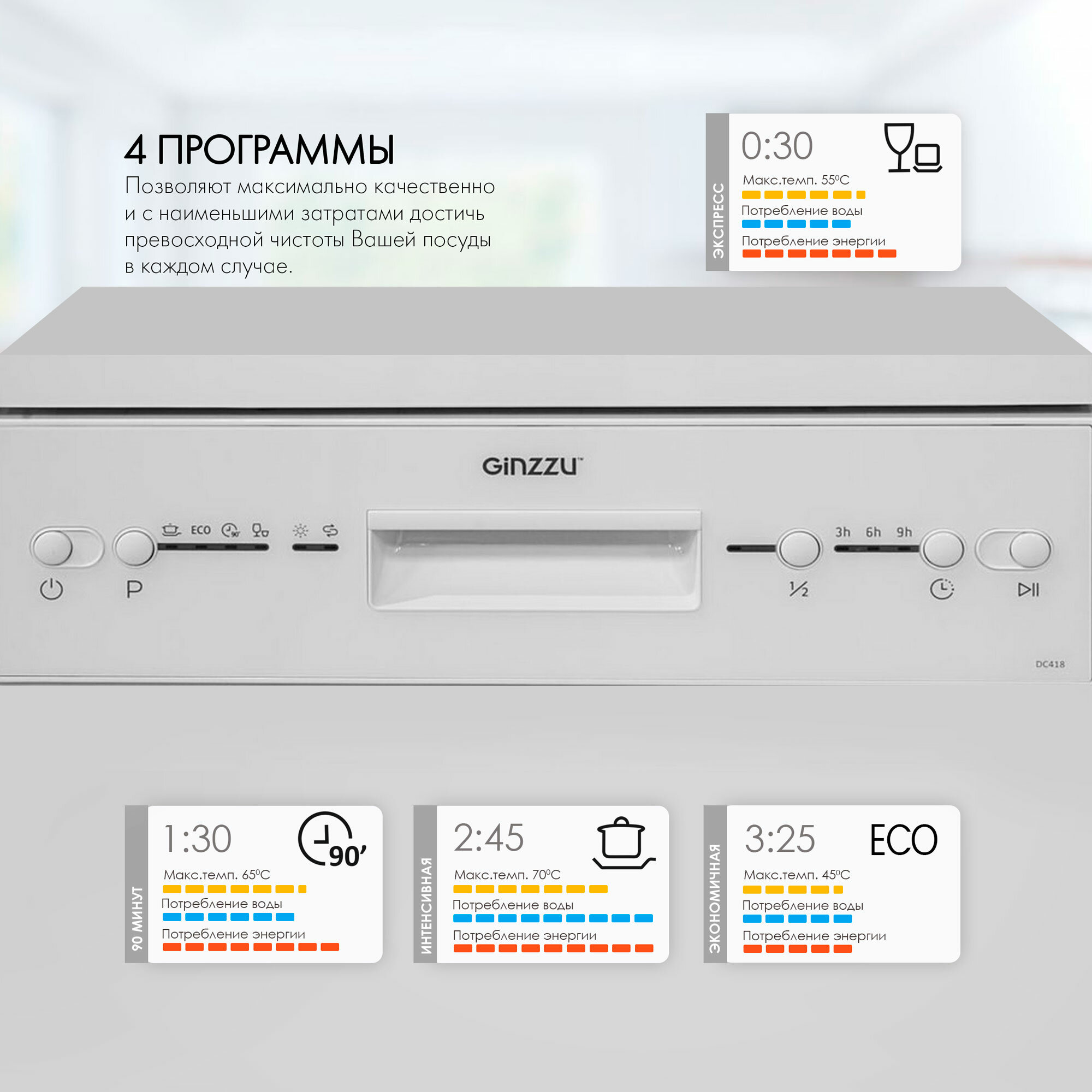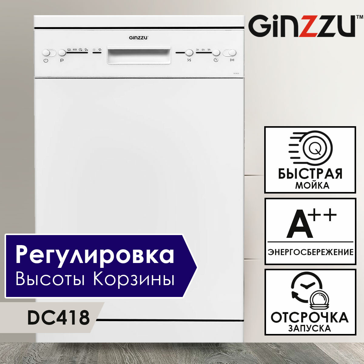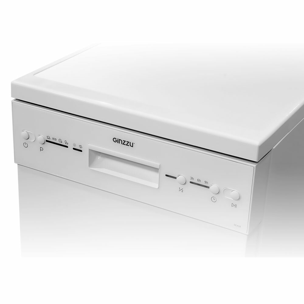 Посудомоечная машина Ginzzu DC418, отдельностоящая, 45х84,5х54 см, 9 комплектов, 4 программы, белая