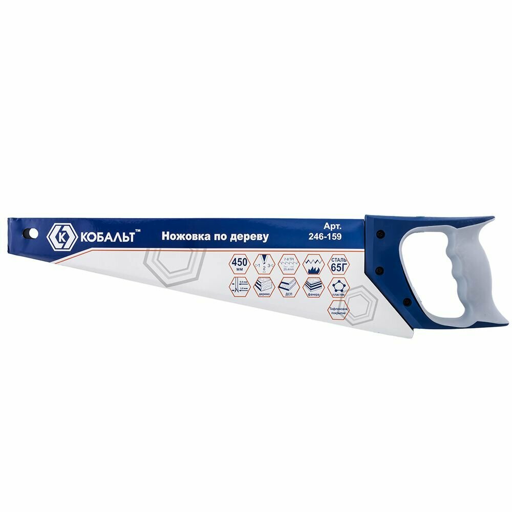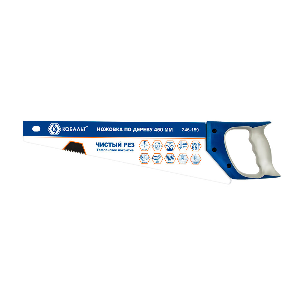 Ножовка по дереву кобальт 450 мм, шаг 3,5 мм/ 7 TPI, тефлоновое покрытиезакаленный зуб, 3D-заточка, двухкомпонентная рукоятка, чистый рез