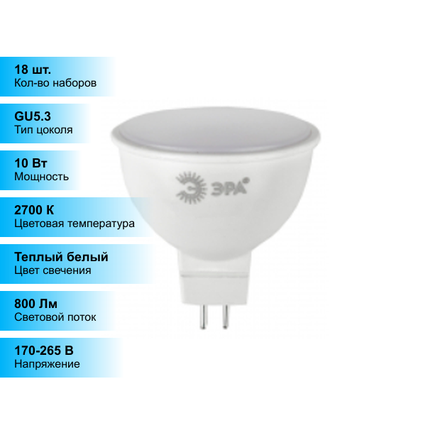 (18 шт.) Светодиодная лампочка ЭРА MR16 10Вт 170-265В 2700К GU5.3