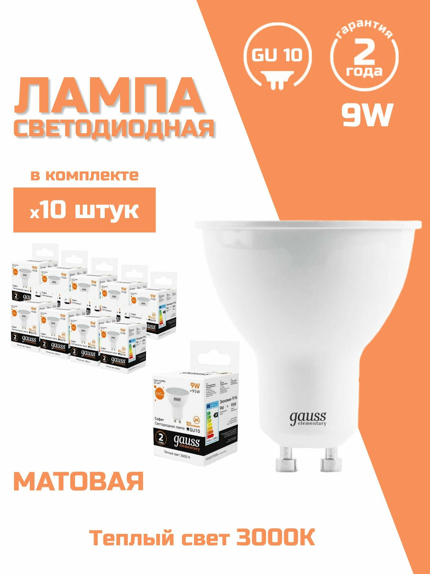 Лампа светодиодная Gauss GU10 9W 3000K матовая 13619 10шт.