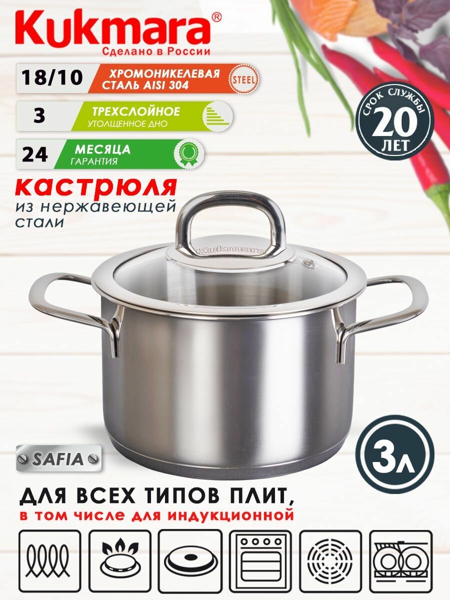 Кастрюля из нержавеющей стали 1,5л со стеклянной крышкой, линия "Safia" Kukmara