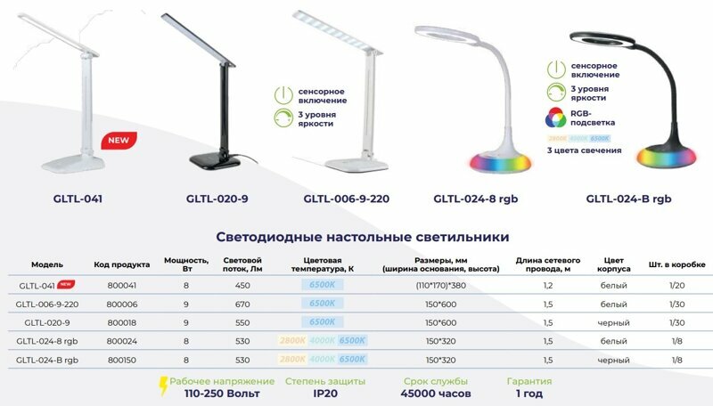 Настольный светильник GLTL-034-2, 8 Вт, сенсорный, с часами, белый
