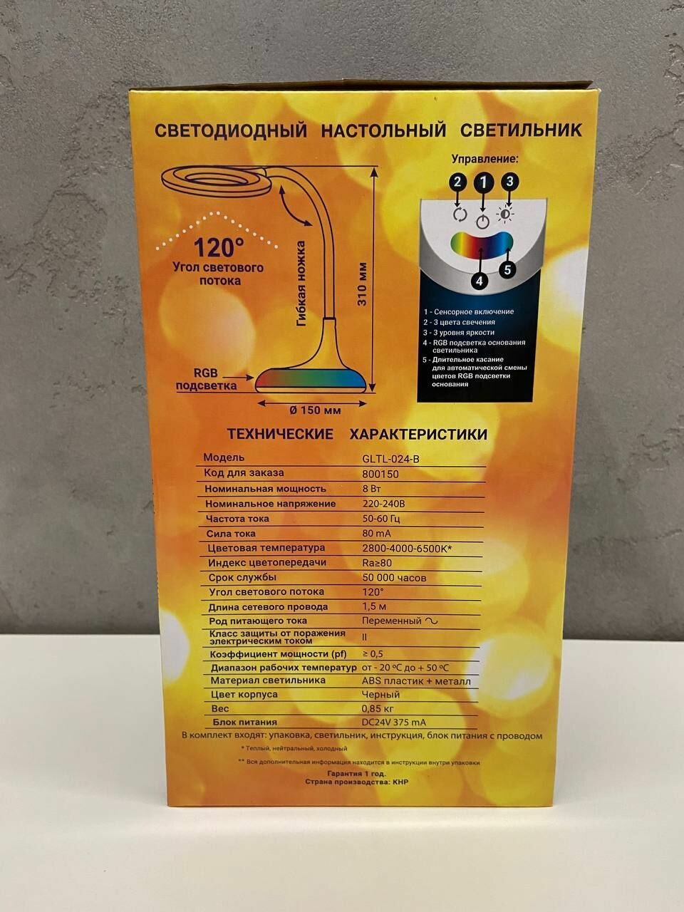 Светильник настольный LED 8ВТ GLTL-024-B черный rgb+сенс вкл, 3 шага диммир, 3 ур
