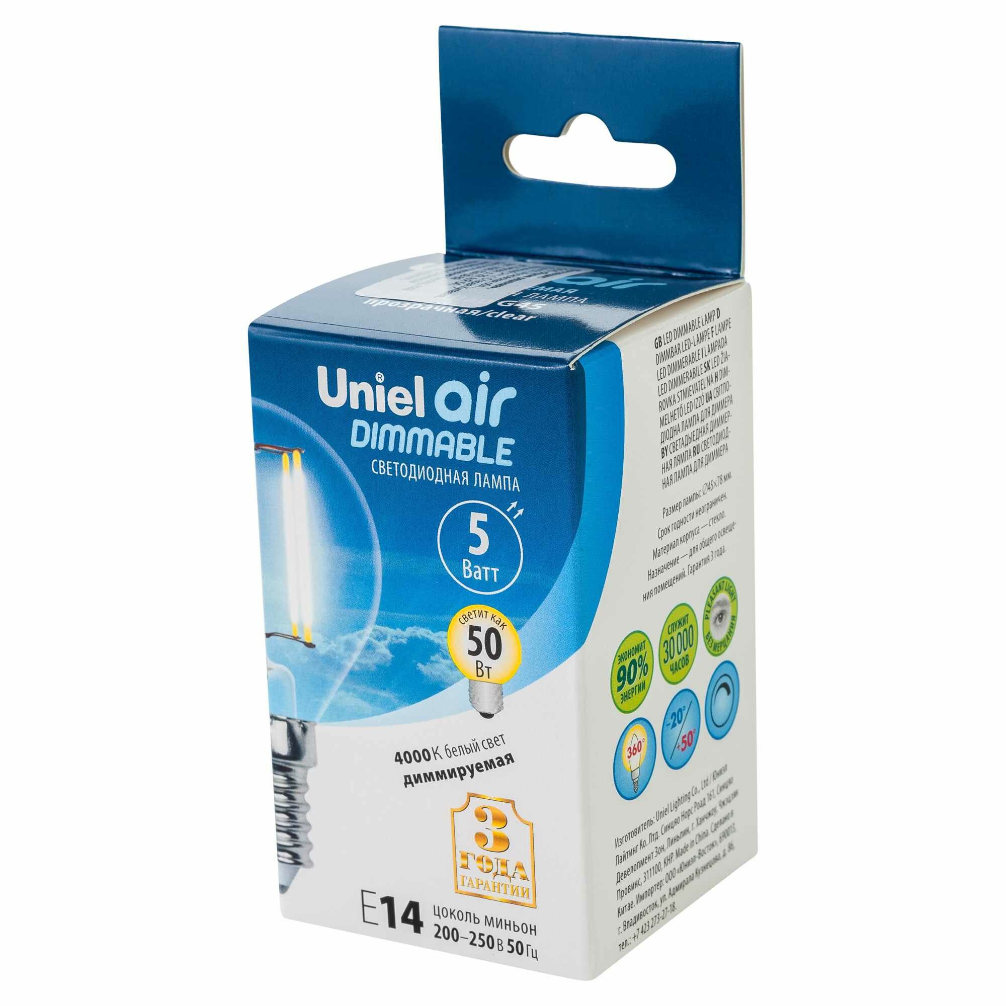 Типы/Лампочки/Филаментные Uniel Лампа светодиодная филаментная Uniel E14 5W 4000K LED-G45-5W/NW/E14/CL/DIM GLA01TR UL-00002870