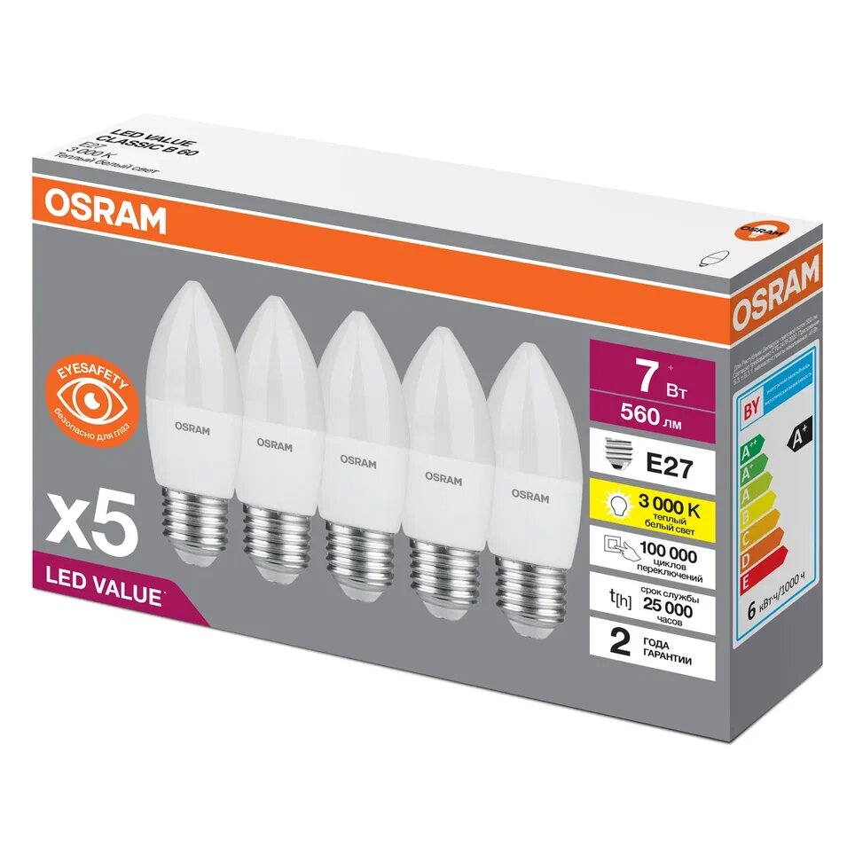 Упаковка из 5 светодиодных ламп LED Value LVCLB60 7SW/830 230В E27 RU OSRAM