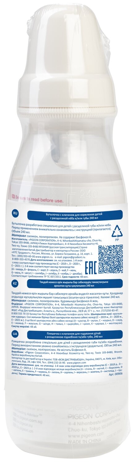 Бутылочка с клапаном для кормления детей, Pigeon, с расщелиной неба или губы, 240 мл