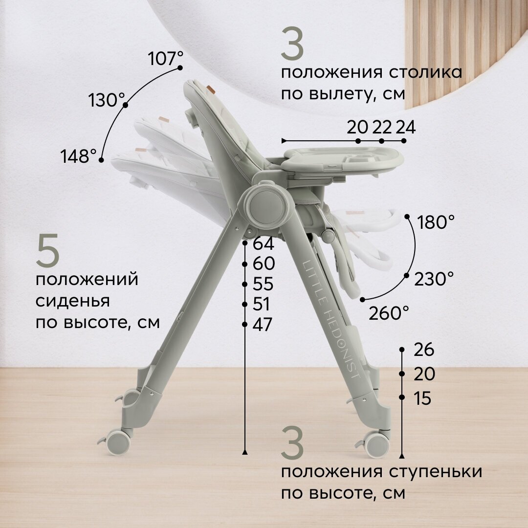 | Регулировка | высоты стульчика / наклона спинки / положения подножки / положения столика |