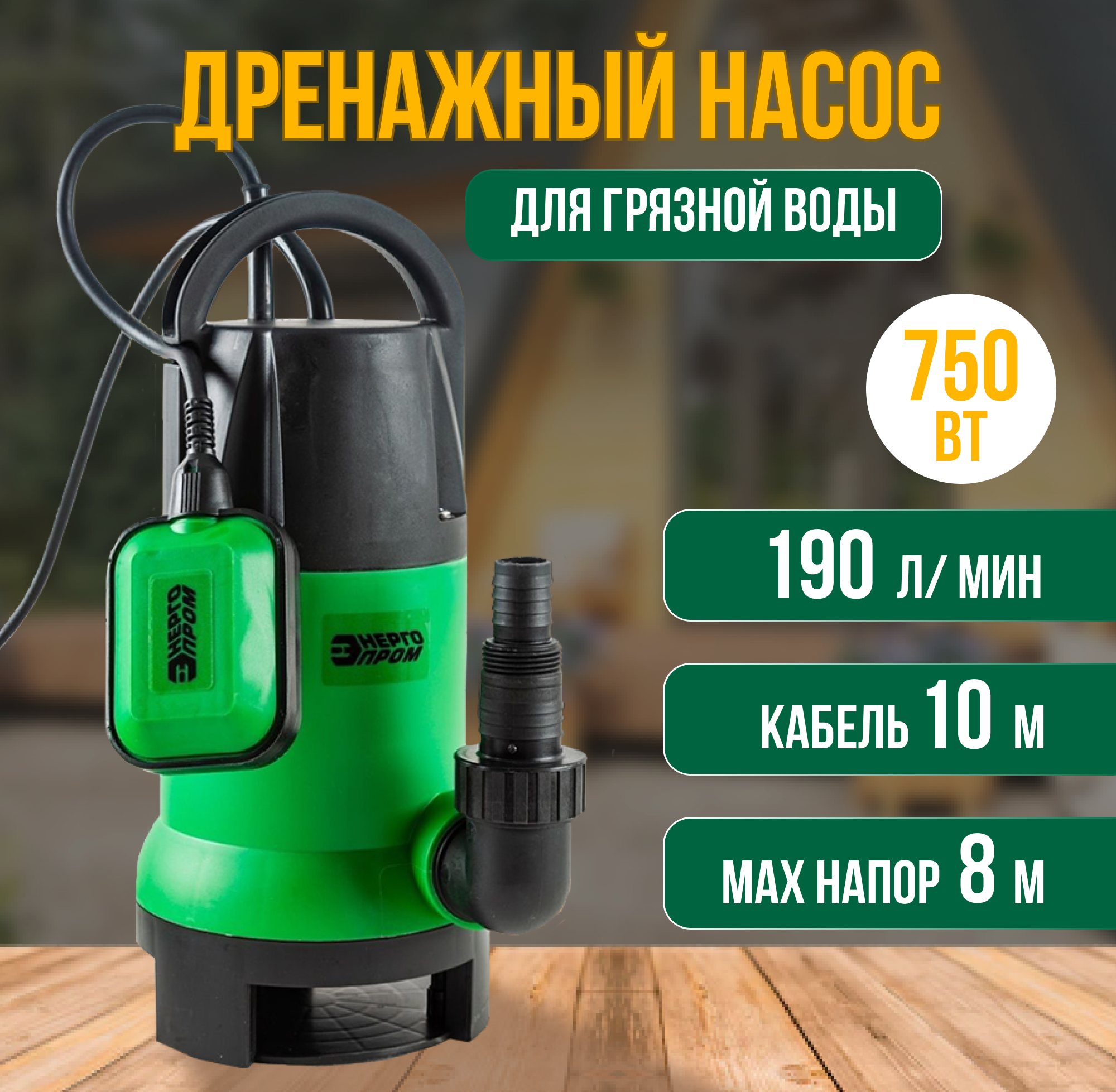 Насос погружной дренажный Энергопром НПД-750ГР/10А для грязной воды, погружение 7м, защита от сухого хода, поплавковый механизм