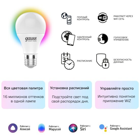 Умная Wi-Fi лампочка Gauss Smart Home А60 10W 1055лм E27 RGBW, управление голосом/смартфоном