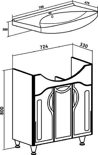 | Комплектация | 1 тумба под раковину, 1 умывальник Стиль 75, 3 ручки, 4 ножки. |