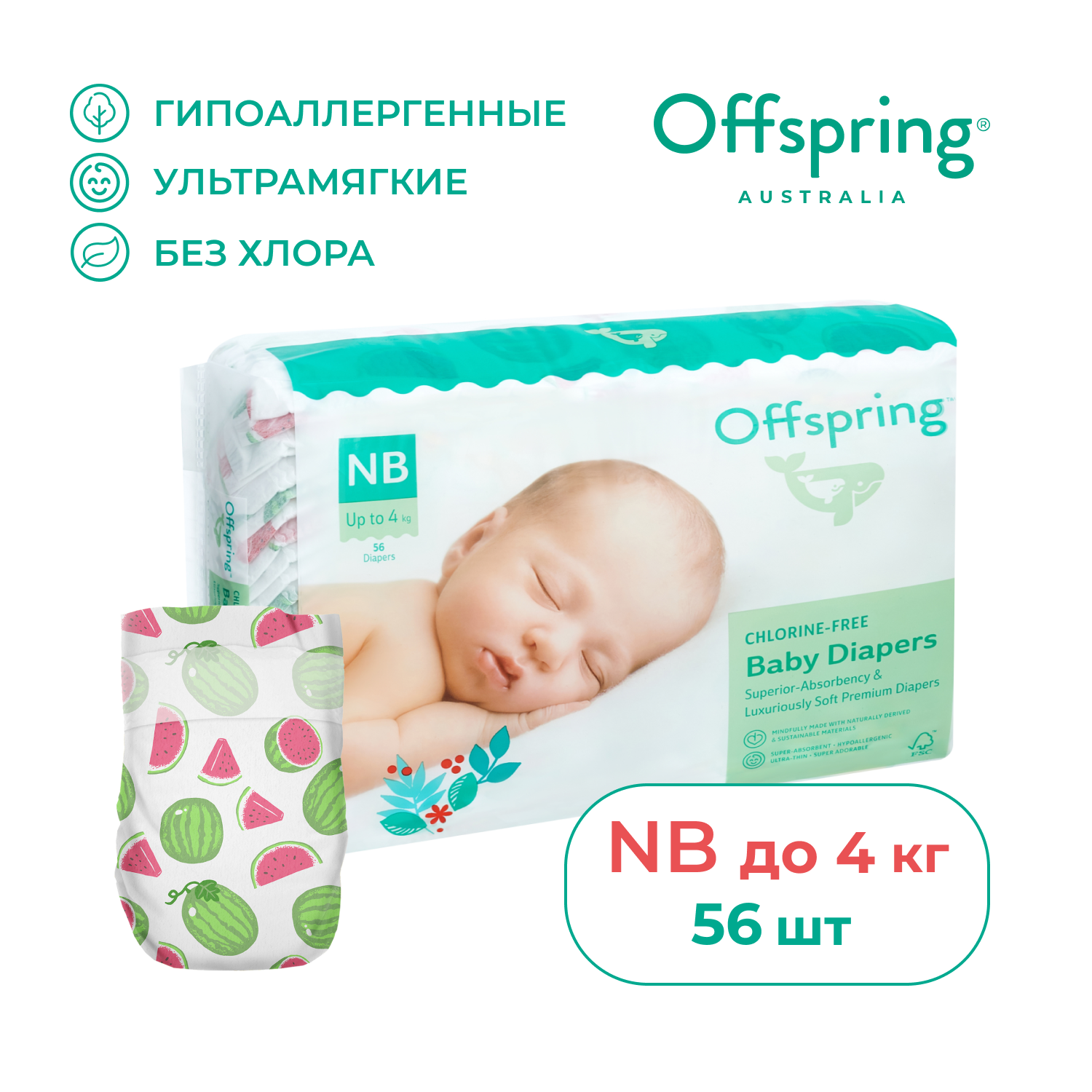 Offspring подгузники NB (до 4 кг), 56 шт., арбузы