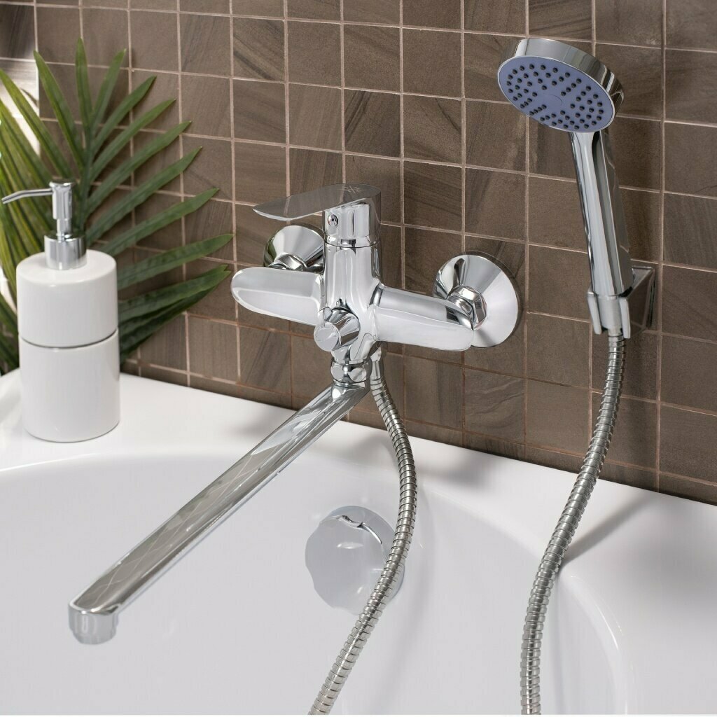 Смеситель для ванны, РМС SL133-006E, длинный поворотный излив, однорычажный, с душевой лейкой
