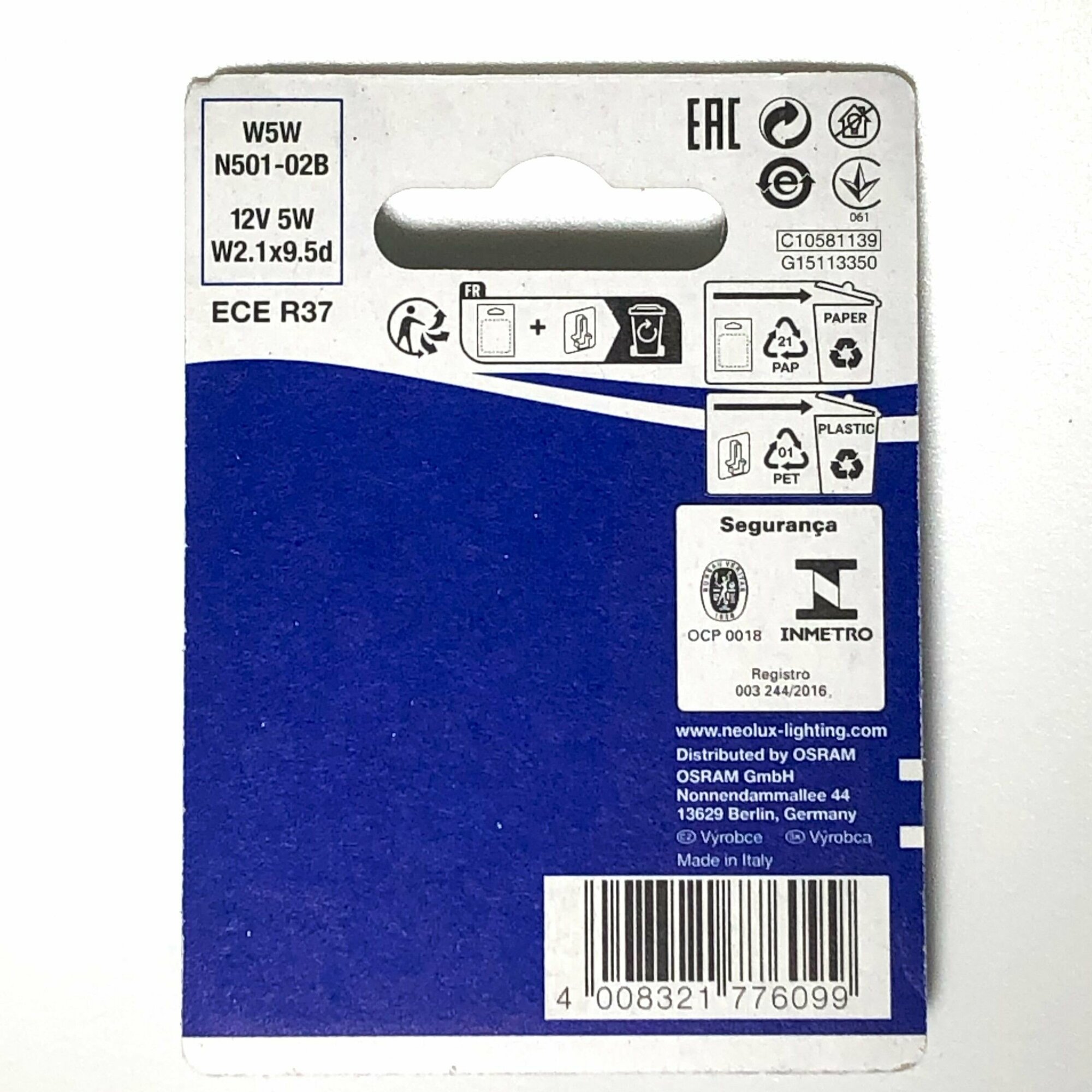К-т ламп W5W 12V 5W W2.1X9.5d (2 шт.), N50102B NEOLUX N501-02B