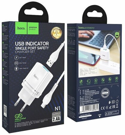 Сетевое зарядное устройство HOCO N1 Ardent 1xUSB с Кабелем USB - Micro, 2.4A, 10.8W, белый