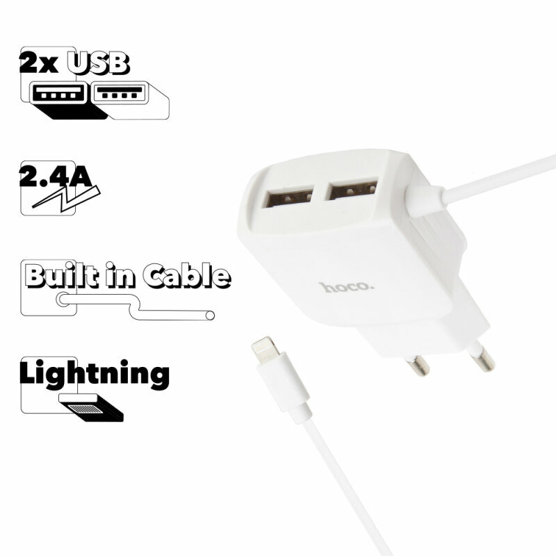 Сетевое зарядное устройство HOCO C59A Mega Joy 2xUSB с кабелем Lightning, 2.4A, белый