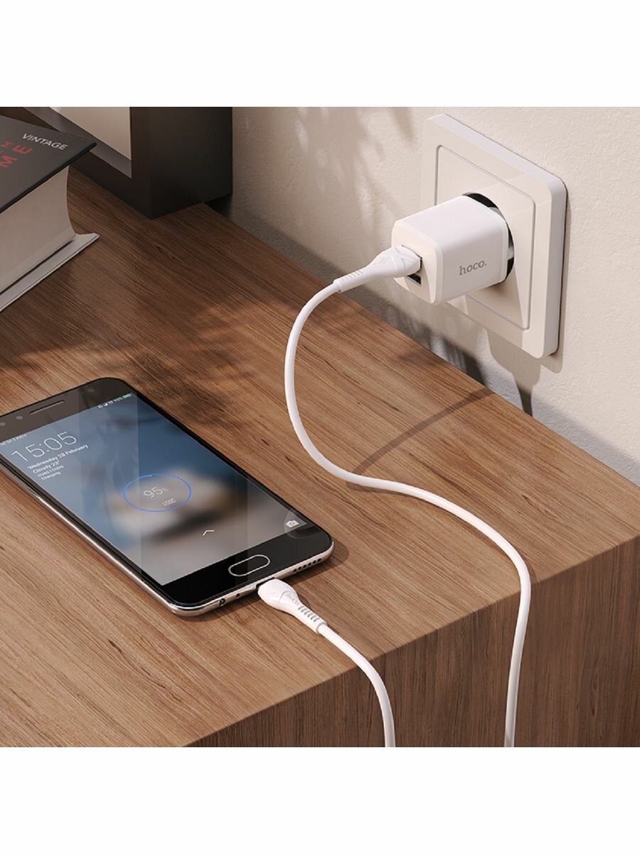 Блок питания сетевой 2 USB HOCO N8, Briar, 2.4A, с кабелем микро USB, 1.0м, поликарбонат, цвет: белый