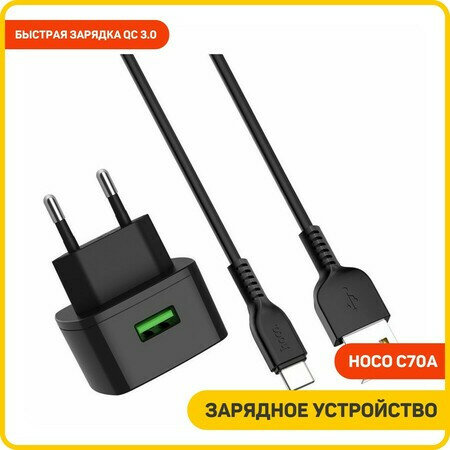 Купить Сетевое зарядное устройство (СЗУ) Hoco C70A QC 3.0 (USB) + кабель Type-C, 3 A, черный