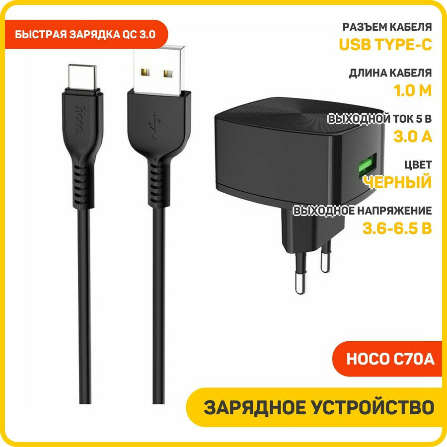 СохранитьСетевое зарядное устройство (СЗУ) Hoco C70A QC 3.0 (USB) + кабель Type-C, 3 A, черный интересное: