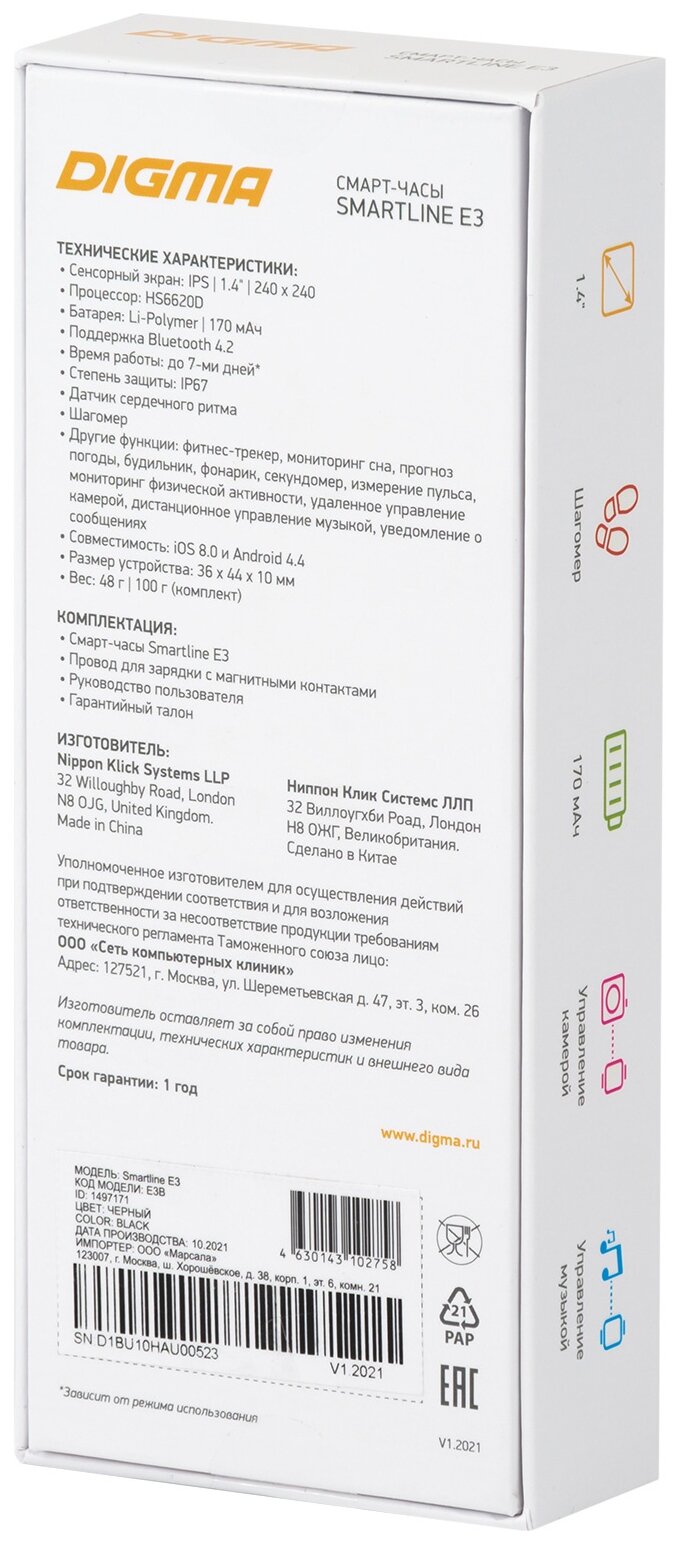 | Дополнительная информация | комплектация: смарт-часы Smartline E3, провод для зарядки с магнитными контактами, руководство пользователя, гарантийный талон; фитнес-трекер, прогноз погоды, удаленное управление камерой, дистанционное управление музыкой |